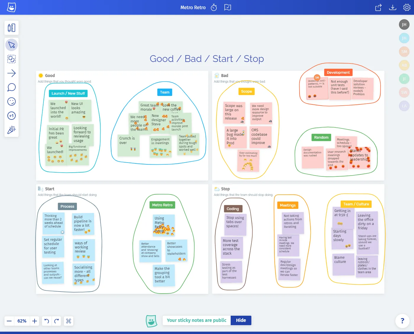 It also wasn’t a great experience for the remote team members who had to video call into the retrospective. We had to put their sticky notes up on the board for them while they explained them.”