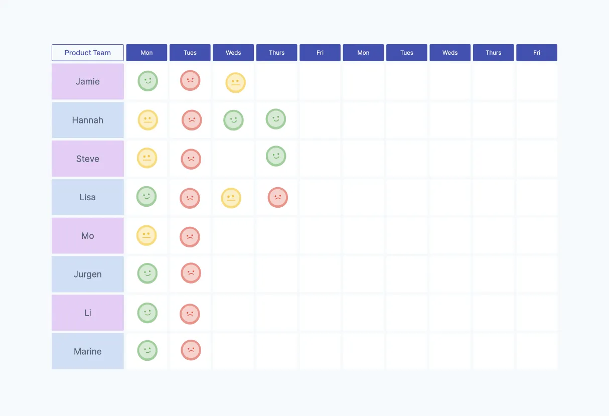 When a team wants to track their mood as a metric, there are various ways to collect, track, and analyze the data together. A Niko-Niko calendar is a simple, visual way to collect daily mood data.
