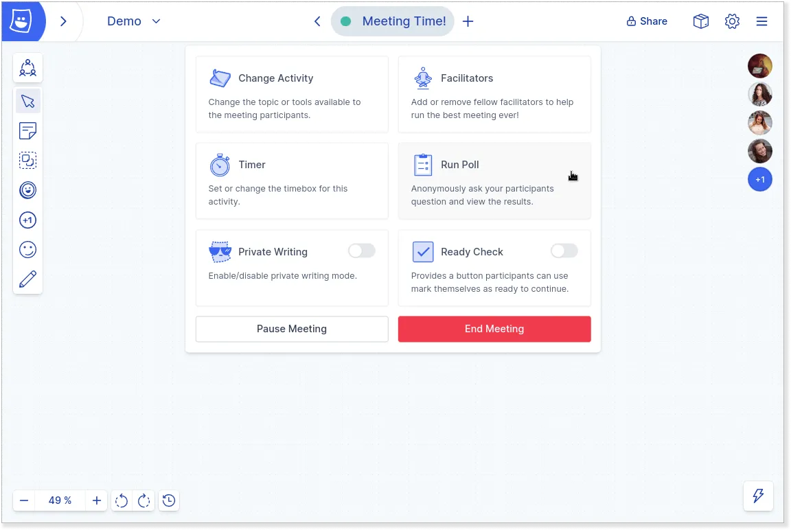 As the facilitator, use ‘Everyone to me’ to get everyone to the right place on the board, then check if everyone is ready to proceed with the new ‘Ready Check’, and after the meeting use a Poll to ask for anonymous feedback on the meeting. You’ll soon know how the team are feeling about your meetings!