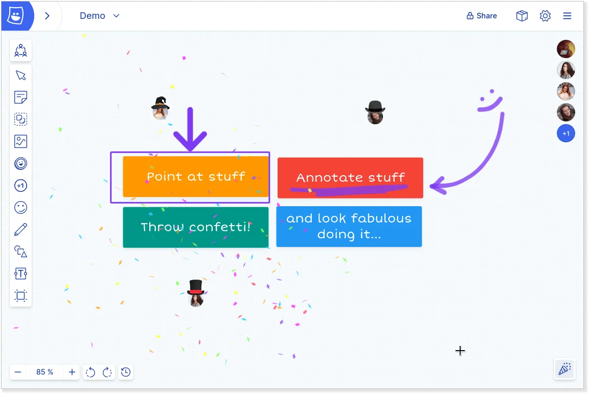 Well, we think collaborative software should be enjoyable and fun to use. Why shouldn’t you be able to scribble a big fat ❌ on out of scope stickies, or just wear a virtual hat when you feel like it?