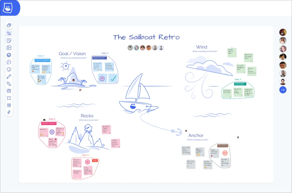 Ludi is filled with pre-made templates to kick-start you meetings, such as our sprint retrospective templates like The Sailboat.
