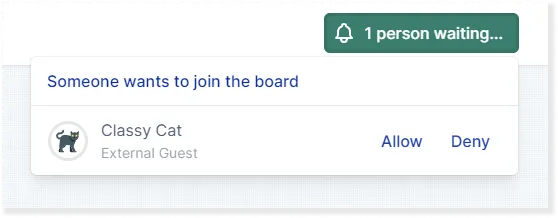 You can see all the guests that have access to to the board, and you can kick guests off the board. A guest’s access to a board lasts 24 hours, after which they will need to request access again.